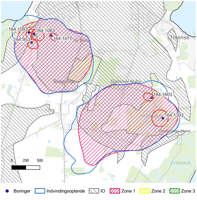 Der er afgrænset IO indenfor store dele af indvindingsoplandene. På baggrund af grundvandsdannelsen er der udpeget 1 prioriteret zone i zone 1 i begge indvindingsoplande.