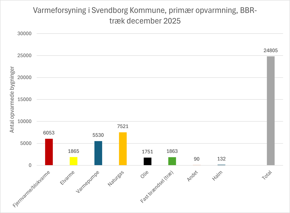 I Svendborg Kommune er der 24.805 opvarmede bygninger. Størstedelen af bygningerne opvarmes med naturgas, fjernvarme og varmepumper, hvilket kan ses af figur 1, som viser fordelingen af opvarmede bygninger i forhold til primære varmekilde. Herefter udgør de øvrige varmekilder som olie, træ og elvarme også væsentlige andele. Betegnelsen varmepumpe dækker over både luft-til-vand varmepumper, jordvarme og luft-til-luft varmepumper, hvis dette er den primære opvarmningsform.