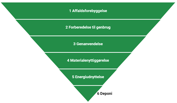 Affaldshierarkiet er grundstenen for arbejdet med affald og ressourcer. Affaldshierarkiet beskriver et hierarkisk system for hvordan vi ønsker at håndtere vores affald. Vi vil have mest af det fra toppen (affaldsforebyggelse) og mindst af det fra bunden (deponi). Arbejdet med affald i Svendborg Kommunes sker også ud fra affaldshierarkiet. Temaerne, indsatsområderne og aktiviteterne i affaldsplanen er derfor udvalgt med fokus på at få håndteret så meget affald så højt oppe i hierarkiet som muligt.