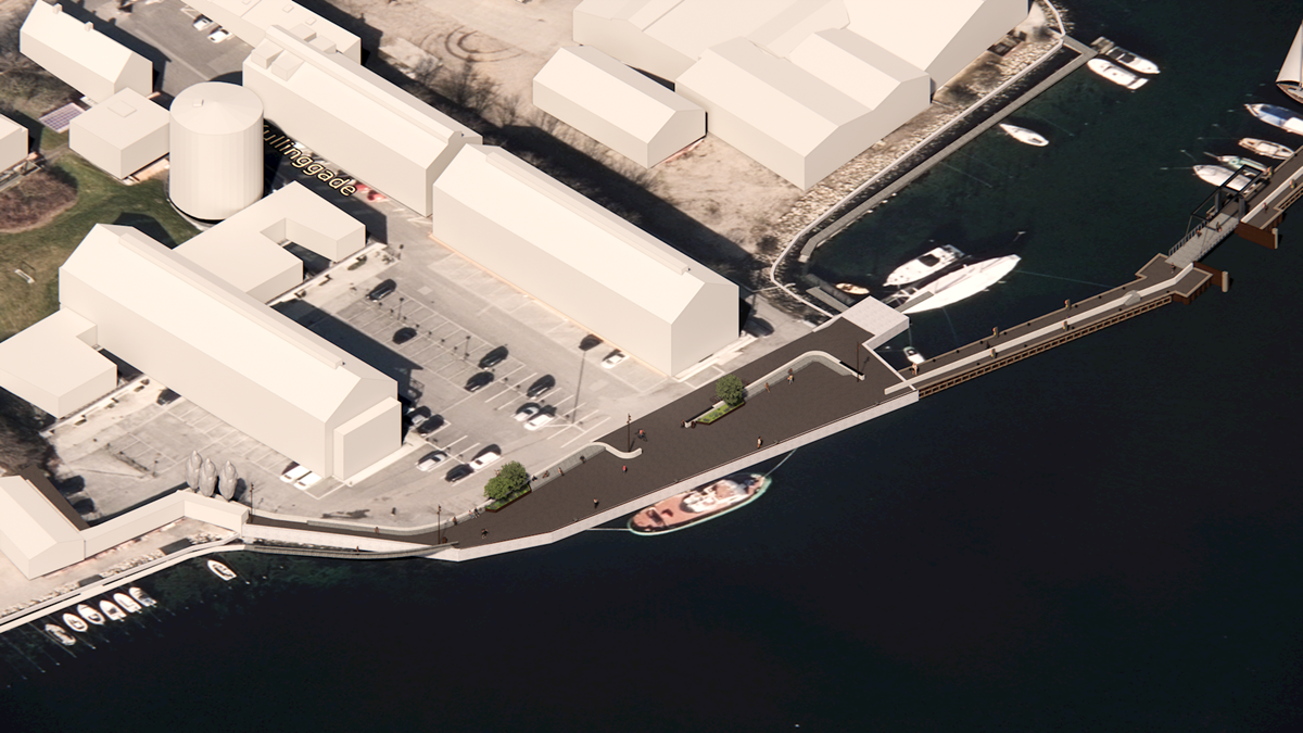 oversvømmet ved højvandshændelser. Sydligst på Gasværkskajen bliver der etableret en niveaufri adgang i form af en rampe til det lidt lavere liggende område ved Tuxensvejs Bådelaug, hvor Den Blå Kantfodgængerforbindelsen fortsætter mod Den Runde Lystbådehavn.