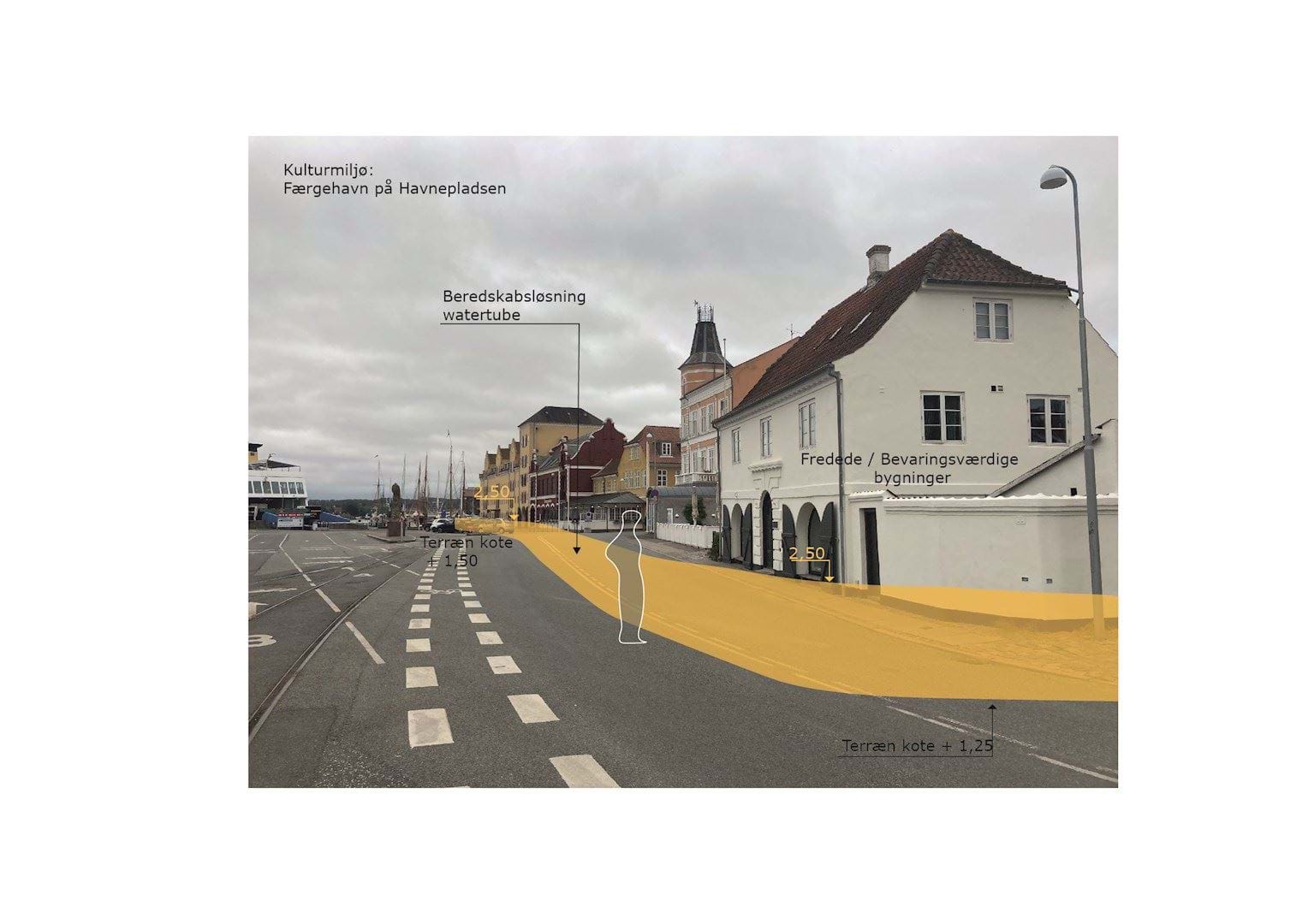 Når en efterfølgende etape i højvandssikringen senere etableres, vil højvandsmuren i facader og skel næppe være synlig og beredskabsløsningen på den 110 m lange strækning på Havnepladsen kan afskaffes ellers benyttes andet sted på havnen.