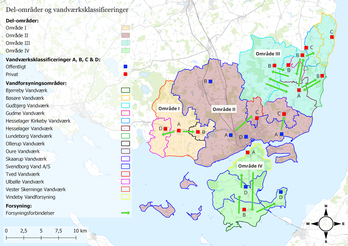 I Svendborg Kommune er der fire overordnede forsyningsområder, hvor et eller flere vandværker, er garant for den sikre forsyning af hele området. Disse vandværker benævnes som A-vandværker – Se nedenfor. De fire områder er benævnt område I til IV: