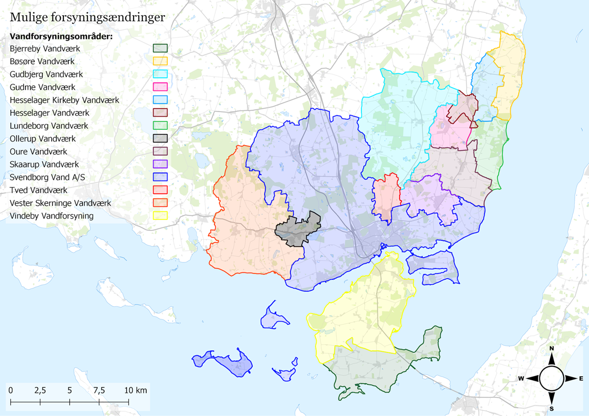 Med denne plan må D-vandværkerne nedlægge indenfor planperioden. Forsyningsområderne må dermed ændres til at følge grænserne, som det fremgår af nedenstående kort. Se gennemgangen af vandværkerne for yderligere oplysninger.